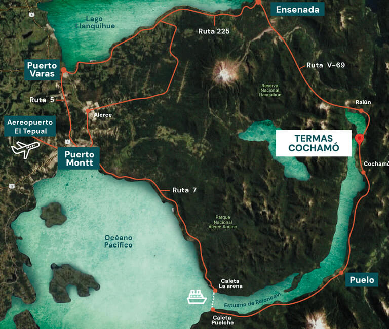 Desde Puerto Varas inicia por la ruta 225 que bordea el lago Llanquihue hacia Ensenada. Luego dobla en dirección hacia Ralún – Cochamó, conocida como ruta V–69, unos kilómetros después de Ensenada. Cruza el puente donde el río Petrohué descarga sus aguas en el Estuario de Reloncaví o primer fiordo de la Patagonia.